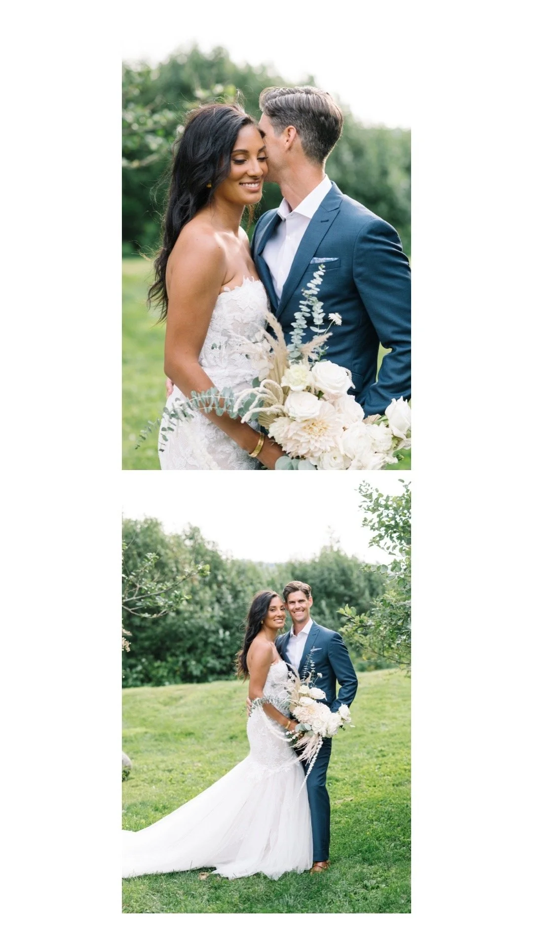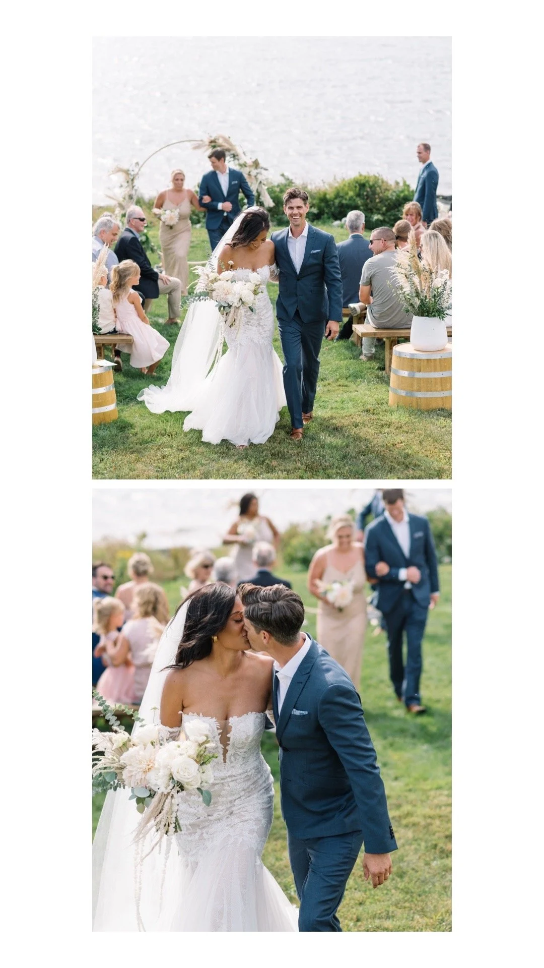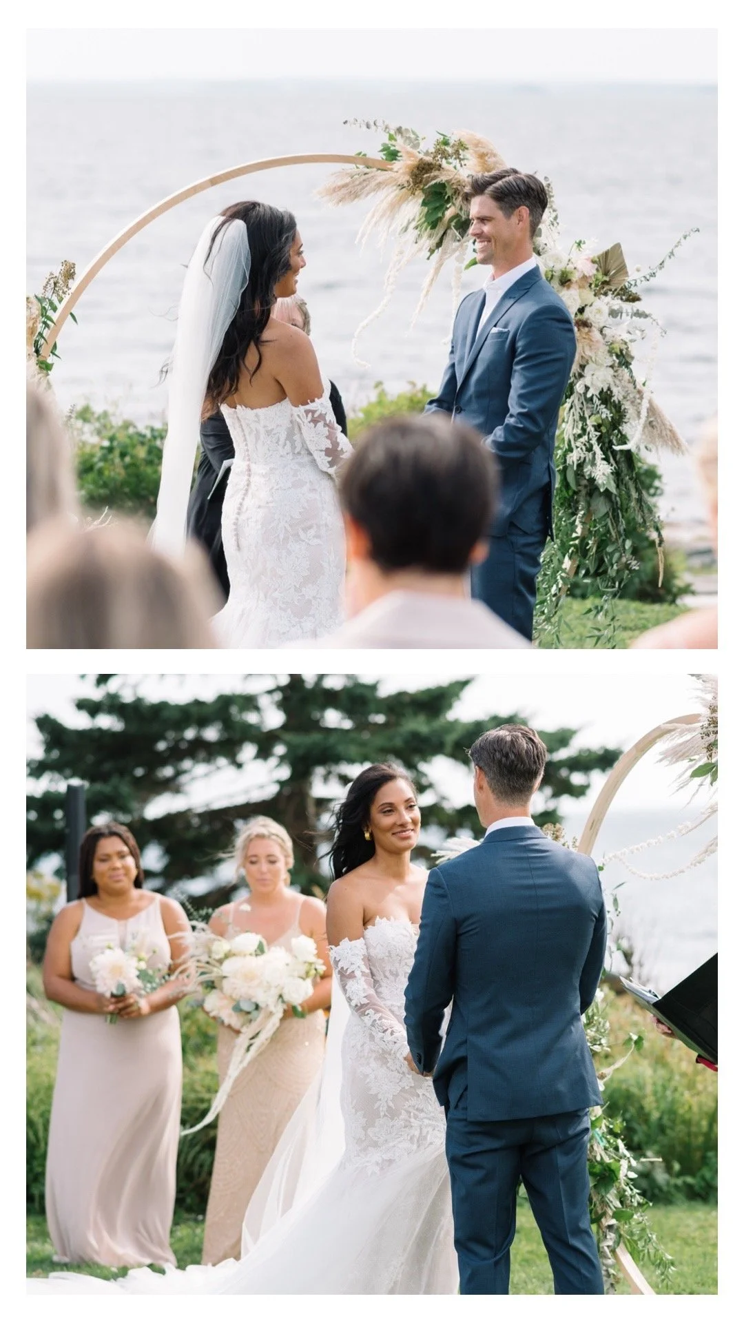 Starting with the bridal details, Celina wore vintage gold Tiffany’s jewelry from her mother and had the children in the family collect seashells from nearby to include in her flat lays (and for “something blue”). The bridal party’s makeup was done by the talented Danielle Grasley Makeup, who gave them all the perfect summer glow! Together, Celina & Ryan designed the invitations and other stationary themselves, which included an illustration of the venue and a map for their guests. Prop’s Floral provided the bouquet and other florals which adorned the ceremony arch, aisle, and tables. Celina’s breathtaking gown is from Tatum’s Fashion and Bridal in Windsor, NS, and had not one but TWO distinct looks with removable sleeves - the detail on this dress is TO DIE FOR.